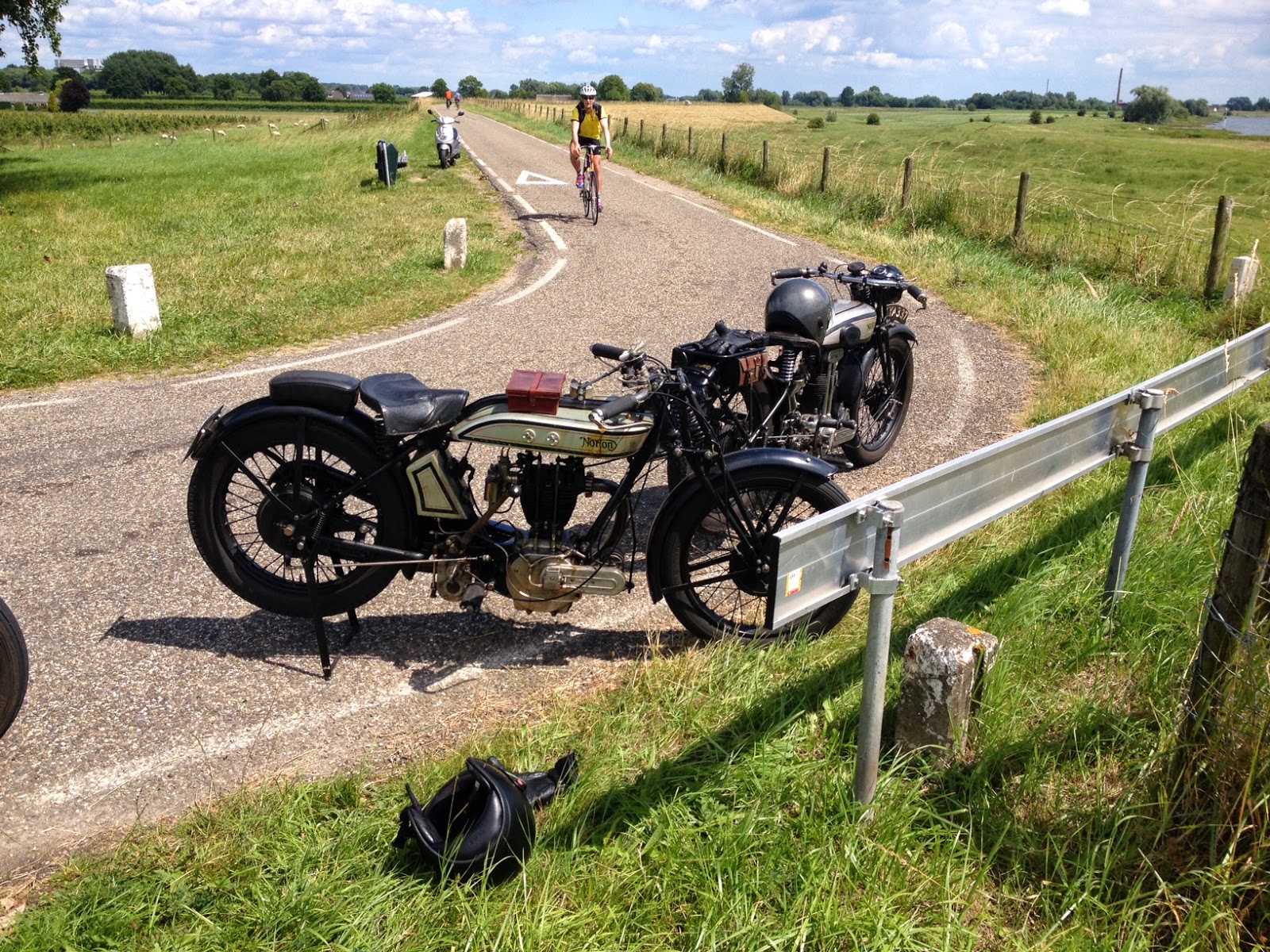 Ruud en Mascha werden uitgezwaaid en door ging het, naar Amerongen, op drie Nortons, om te zien of Hans z'n brommer het al doet. Het antwoord blijven we schuldig; wellicht was Hans op de brommer op stap maar hij was niet thuis. Dus een biertje op het terras en over de dijk naar huis.